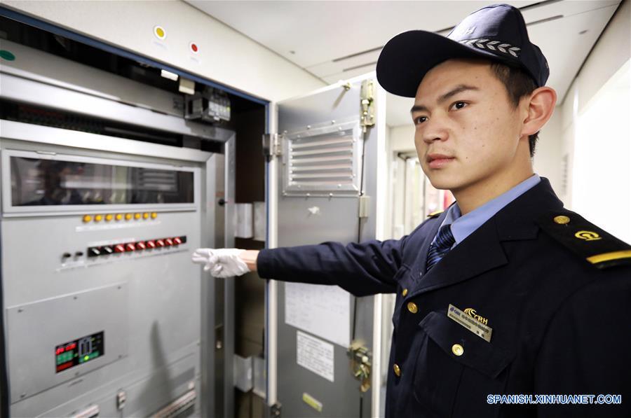 Un mecánico que sirve para el primer tren que va a comenzar operaciones en la línea ferroviaria Chongqing-Guiyang posa en la Estación del Ferrocarril Guiyan, en Guizhou, en el suroeste de China, el 16 de enero de 2018. La línea ferroviaria Chongqing-Guiyang conecta a Chongqing y Guiyang, dos principales ciudades en el suroeste de China. Dise?ada para trenes de pasajeros con una velocidad máxima de 200 kilómetros por hora, la línea ferroviaria mejorará el tránsito regional. (Xinhua/Liu Xu)
