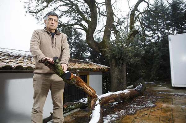 José Velez sujeta una rama caída de una encina enferma que tiene en la actualidad amenazando su casa. áNGEL NAVARRETE