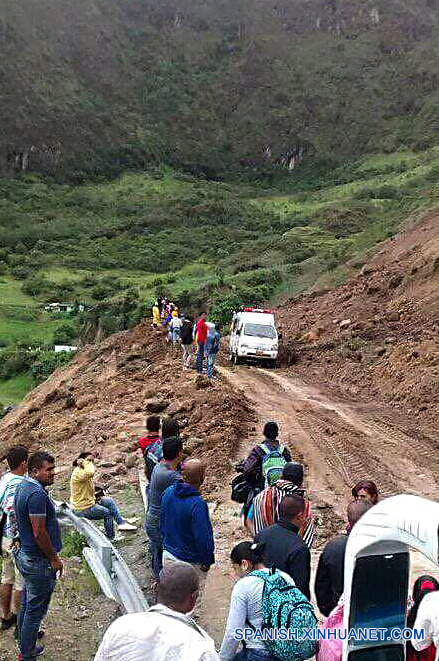NARI?O, enero 21, 2018 (Xinhua) -- Personas permanecen en el sitio de un accidente causado por un deslizamiento de tierra, en la vía Tumaco, en Nari?o, Colombia, el 21 de enero de 2018. Un autobús de servicio público de la empresa Supertaxis, que transportaba a 13 personas, quedó sepultado el domingo tras un derrumbe en la vía que comunica a la ciudad de Pasto con Tumaco, en el departamento de Nari?o en la zona conocida como "Naríz del diablo", informaron las autoridades colombianas. (Xinhua/Leonardo Castro/COLPRENSA)