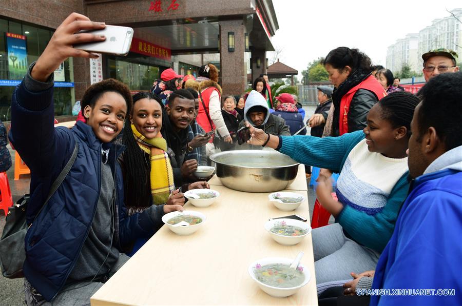 ZHENJIANG, enero 22, 2018 (Xinhua) -- Estudiantes extranjeros de la Universidad de Jiangsu procedentes de Pakistán, Jamaica y Etiopía, se toman "selfies" con gachas de Laba en Zhenjiang, provincia de Jiangsu, en el este de China, el 22 de enero de 2018. El festival de Laba, es un festival tradicional que se celebra el día 8 de 12 mes lunar, que cae el 24 de enero este a?o. Durante este día se comen las gachas de laba, usualmente hechas con ocho ingredientes, representando las oraciones de la gente para la cosecha. (Xinhua/Shi Yucheng)