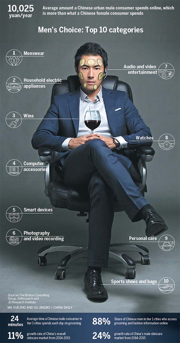 Zong Ning, un analista de comercio electrónico con sede en Beijing, dijo en una columna del sitio web iResearch que a la vez que los hombres jóvenes conocedores de tecnologías, especialmente aquellos nacidos en la década de los 90, gradualmente se convierten en la fuerza influyente en el mundo del consumo, la demográfica emergente está creando nuevos impulso en el mercado de productos y servicios para hombres.
