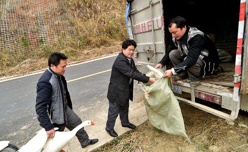 Yang Wen compra gansos de Tang Jinyang (primero a la derecha) en la aldea Huyang, condado de Leishan, prefectura autónoma Miao y Dong de Qiandongnan, provincia de Guizhou, en diciembre de 2017. Yang Wen regaló un total de más de 200 crías de gansos a Tang. [Foto / VCG]