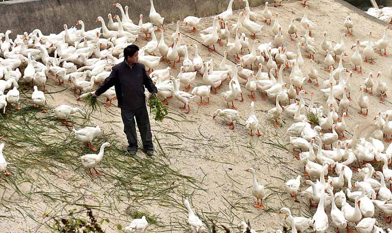 Yang Wen alimenta a sus gansos con yerba de las monta?as cerca de un embalse en la aldea Zhangcun, condado de Leishan, en la prefectura autónoma Miao y Dong de Qiandongnan, provincia de Guizhou, en diciembre de 2017. [Foto / VCG]