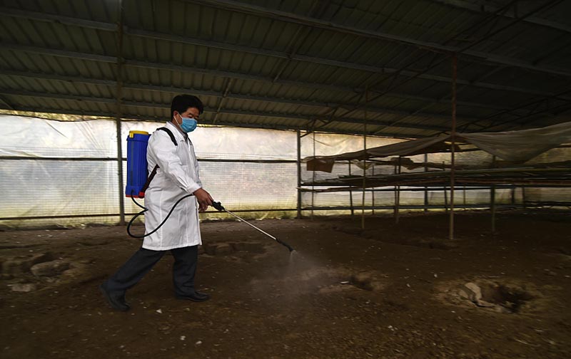 Yang Wen esteriliza las naves donde viven los gansos cerca de un embalse en la aldea Zhangcun, condado de Leishan, en la prefectura autónoma Miao y Dong de Qiandongnan, provincia de Guizhou, en diciembre de 2017. [Foto / VCG]