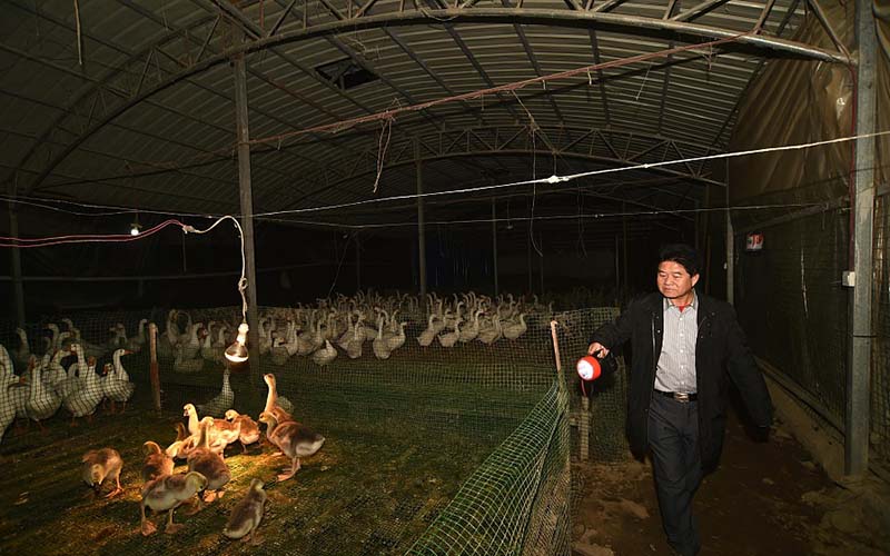 Yang Wen comprueba que sus gansos estén bien antes de acostarse cerca del embalse en la aldea Zhangcun, condado de Leishan, en la prefectura autónoma Miao y Dong de Qiandongnan, provincia de Guizhou, en diciembre de 2017. [Foto / VCG]