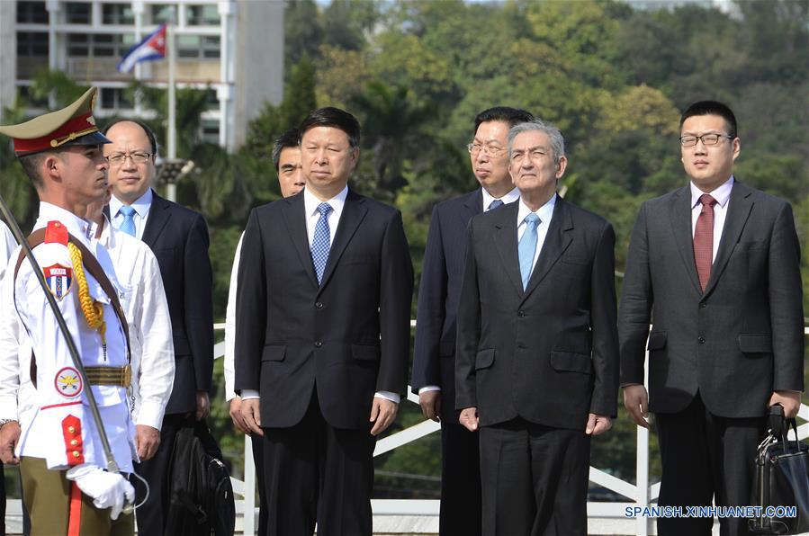 LA HABANA, enero 22, 2018 (Xinhua) -- El enviado especial del secretario general del Comité Central del Partido Comunista de China (PCCh), Xi Jinping, Song Tao (3-i-frente), también director del Departamento Internacional del Comité Central del PCCh, acompa?ado por el jefe del Departamento de Relaciones Internacionales del Comité Central del Partido Comunista de Cuba (PCC), José Ramón Balaguer (2-d), participa en la ceremonia de colocación de una ofrenda floral en el monumento a José Martí, en la Plaza de la Revolución, en La Habana, Cuba, el 22 de enero de 2018. Song Tao, enviado especial del secretario general del Comité Central del Partido Comunista de China (PCCh), Xi Jinping, inició el lunes una visita a Cuba donde dialogó con autoridades del Partido Comunista de Cuba (PCC) y realizó otras actividades. (Xinhua/Joaquín Hernández)