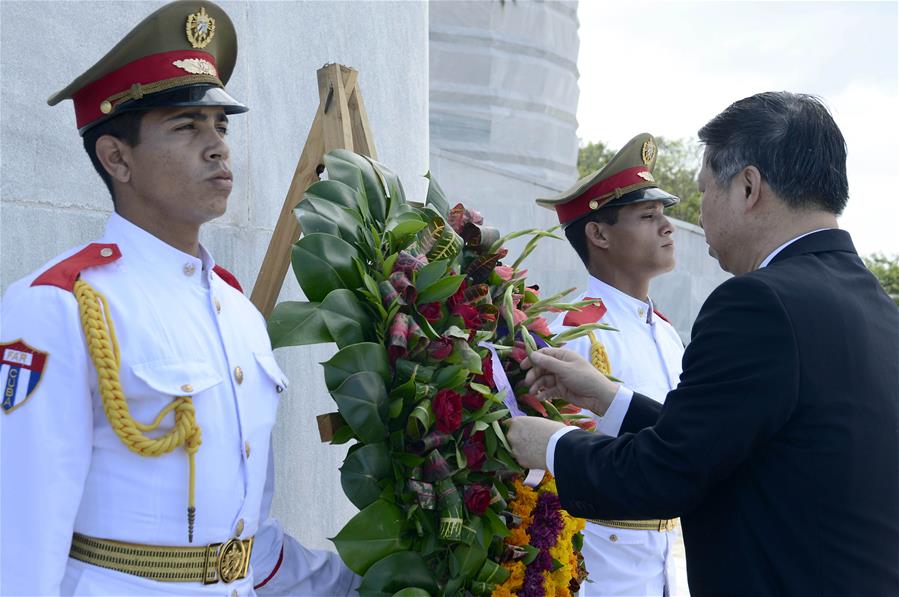 LA HABANA, enero 22, 2018 (Xinhua) -- El enviado especial del secretario general del Comité Central del Partido Comunista de China (PCCh), Xi Jinping, Song Tao (c), también director del Departamento Internacional del Comité Central del PCCh, participa en la ceremonia de colocación de una ofrenda floral en el monumento a José Martí, en la Plaza de la Revolución, en La Habana, Cuba, el 22 de enero de 2018. Song Tao, enviado especial del secretario general del Comité Central del Partido Comunista de China (PCCh), Xi Jinping, inició el lunes una visita a Cuba donde dialogó con autoridades del Partido Comunista de Cuba (PCC) y realizó otras actividades. (Xinhua/Joaquín Hernández)