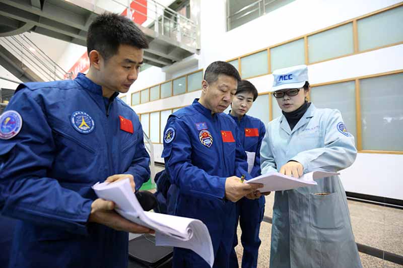 Chen Dong, Liu Wang y Liu Yang conversan con un miembro del equipo durante el entrenamiento de vuelo. [Foto: Feng Yongbin]