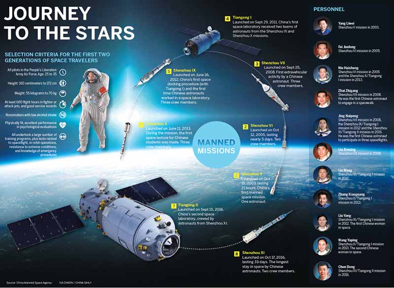 En la actualidad, ellos protagonizan el esfuerzo más espectacular para coronar la próxima década: la construcción y puesta en marcha de la primera estación espacial china. La construcción comenzará en el 2020 y está dise?ada para “estar en pie” al menos 10 a?os. A partir del 2022, cada grupo de astronauta laborará en la estación espacial entre tres y seis meses.