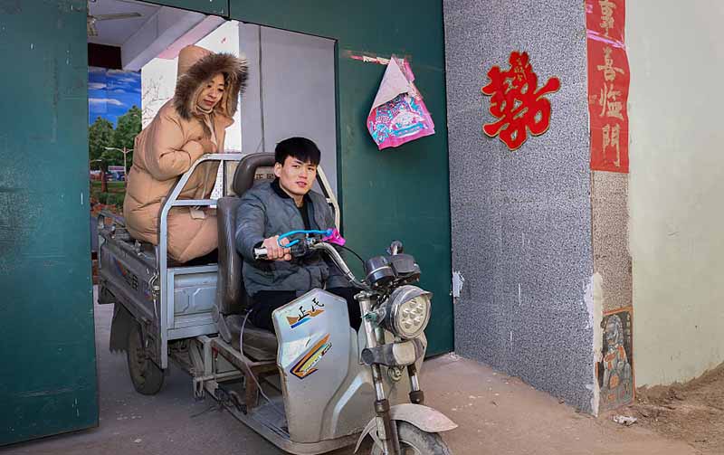 Hao Panpan conduce una motocicleta reacondicionada para ir de compras, el 9 de enero de 2018. El vehículo le permite frenar usando las manos. [Foto / VCG]