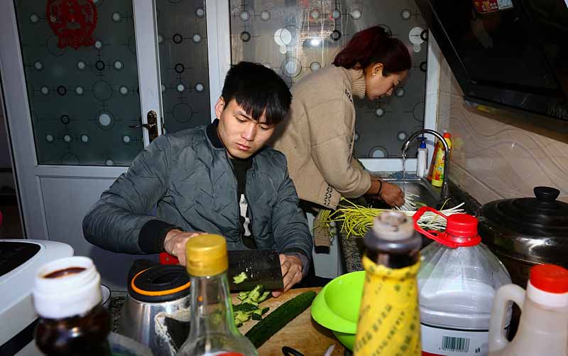 Hao Panpan y su esposa, Fu Chengjun, preparan la cena en casa, el 9 de enero de 2018. [Foto / VCG]