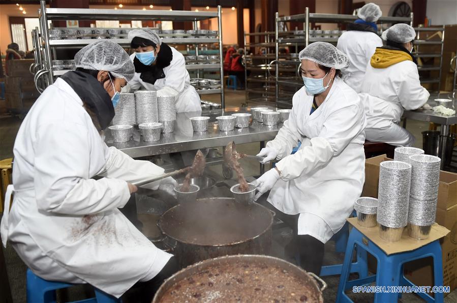 ZHEJIANG, enero 23, 2018 (Xinhua) -- Trabajadoras voluntarias llenan recipientes con gachas de Laba en el Templo Lingyin, en Hangzhou, provincia de Zhejiang, en el este de China, el 23 de enero de 2018. El Festival de Laba, es un festival tradicional chino que se celebra el octavo díadel duodésimo mes lunar, que cae el 24 de enero este a?o. El templo enviará más de 300,000 juegos de gachas de Laba gratis para sitios de construcción, comunidades, hospitales, asilos de ancianos y casas de bienestar durante el Festival de Laba de este a?o. (Xinhua/Huang Zongzhi)