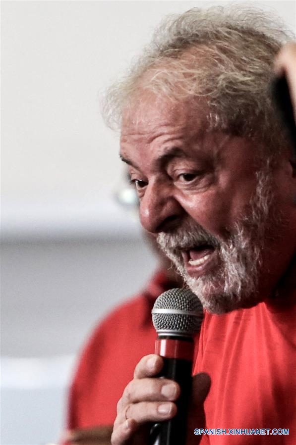 SAO BERNARDO DO CAMPO, enero 24, 2018 (Xinhua) -- El ex presidente de Brasil, Luiz Inácio Lula da Silva, pronuncia un discurso a sus simpatizantes en la sede de la Unión de Trabajadores Metalúrgicos mientras el Tribunal Regional Federal toma una decisión sobre una apelación contra un caso de corrupción que lo imposibilitaría de contender en las elecciones presidenciales de 2018, en Sao Bernardo do Campo, en las afueras de Sao Paulo, Brasil, el 24 de enero de 2018. El Tribunal Regional Federal de la 4a Región (TRF-4), con sede en Porto Alegre en el sur de Brasil, inició el miércoles la sesión en la que debe juzgar el recurso presentado por el ex presidente Luiz Inácio Lula da Silva (2003-2010) contra la condena de nueve a?os y medio de prisión por corrupción pasiva y lavado de dinero que recibió en el marco del caso Petrobras. Tres jueces son los encargados de analizar la apelación presentada por la defensa de Lula, que si es considerado culpable, no podría presentarse a las elecciones generales de octubre próximo, al liderar las intenciones de voto para volver a la presidencia. (Xinhua/Rahel Patrasso)