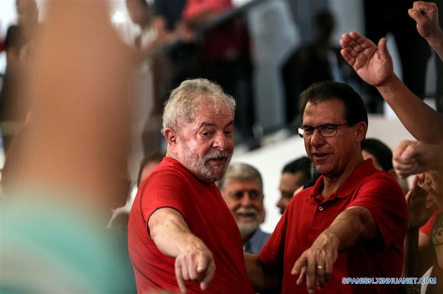 SAO BERNARDO DO CAMPO, enero 24, 2018 (Xinhua) -- El ex presidente de Brasil, Luiz Inácio Lula da Silva (i), interactúa con sus simpatizantes en la sede de la Unión de Trabajadores Metalúrgicos mientras el Tribunal Regional Federal toma una decisión sobre una apelación contra un caso de corrupción que lo imposibilitaría de contender en las elecciones presidenciales de 2018, en Sao Bernardo do Campo, en las afueras de Sao Paulo, Brasil, el 24 de enero de 2018. El Tribunal Regional Federal de la 4a Región (TRF-4), con sede en Porto Alegre en el sur de Brasil, inició el miércoles la sesión en la que debe juzgar el recurso presentado por el ex presidente Luiz Inácio Lula da Silva (2003-2010) contra la condena de nueve a?os y medio de prisión por corrupción pasiva y lavado de dinero que recibió en el marco del caso Petrobras. Tres jueces son los encargados de analizar la apelación presentada por la defensa de Lula, que si es considerado culpable, no podría presentarse a las elecciones generales de octubre próximo, al liderar las intenciones de voto para volver a la presidencia. (Xinhua/Rahel Patrasso)
