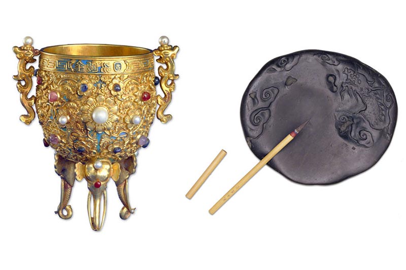 Copa de oro macizo de la dinastía Qing (a la izquierda) y un pincel para caligrafía utilizado por los antiguos emperadores de la dinastía Qing.[Foto: cuenta oficial de Weibo del Museo del Palacio Imperial]
