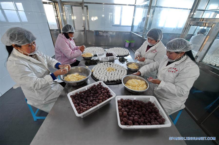 Empleadas elaboran el "niandoubao", una especie de bollo cocido al vapor de pasta azucadrada de frijoles, en la villa de Huanzidong del municipio de Pingxi en Siping, provincia de Jilin, en el noreste de China, el 24 de enero de 2018. En 2015, Chen Lidong y algunas residentes de Huanzidong fundaron una cooperativa profesional para elaborar el bocadillo tradicional "niandoubao". Ellas aprendieron puntos buenos de cada una para el progreso común y estandarizaron la selección de ingredientes, la proporción y las habilidades de elaboración. La producción anual de la cooperativa alcanzó las 400 toneladas, con un valor de salida de 3 millones de yuanes (aproximadamente 469,535 dólares estadounidenses). Los trabajadores del lugar pueden percibir un salario de 2,500 yuanes (aproximadamente 391 dólares estadounideses) al mes. En 2018, Chen planea actualizar el método de almacenamiento y la plataforma de ventas en línea de la cooperativa. (Xinhua/Zhang Nan)