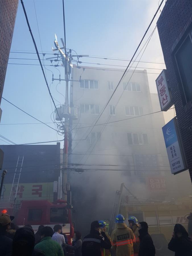 MILYANG, enero 26, 2018 (Xinhua) -- Bomberos combaten un incendio en la ciudad de Milyang, en el sureste de República de Corea, el 26 de enero de 2018. Las víctimas mortales a consecuencia de un incendio el viernes en un hospital de la ciudad suroriental surcoreana de Milyang subió a 33, según confirmaron los bomberos, citados por la prensa local. (Xinhua/Newsis)