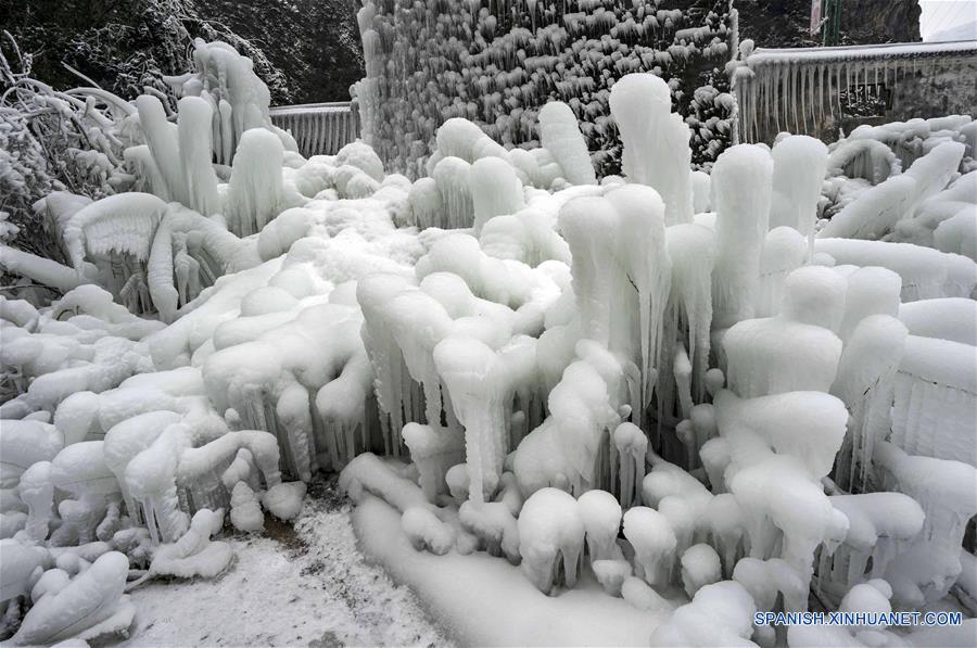 Carámbanos son captados a lo largo de la Autopista Nacional 209 en la villa de Qiaoshang del condado de Fangxian, provincia de Hubei, en el centro de China, el 27 de enero de 2018. (Xinhua/Du Huaju)