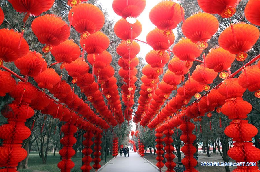 Visitantes caminan en el corredor de linternas en el Parque Ditan, también conocido como el Templo del Parque de la Tierra, en Beijing, capital de China, el 27 de enero de 2018. El Templo del Parque de la Tierra fue decorado con linternas rojas para celebrar el próximo Festival de Primavera o A?o Nuevo Lunar chino. (Xinhua/Chen Xiaogen)