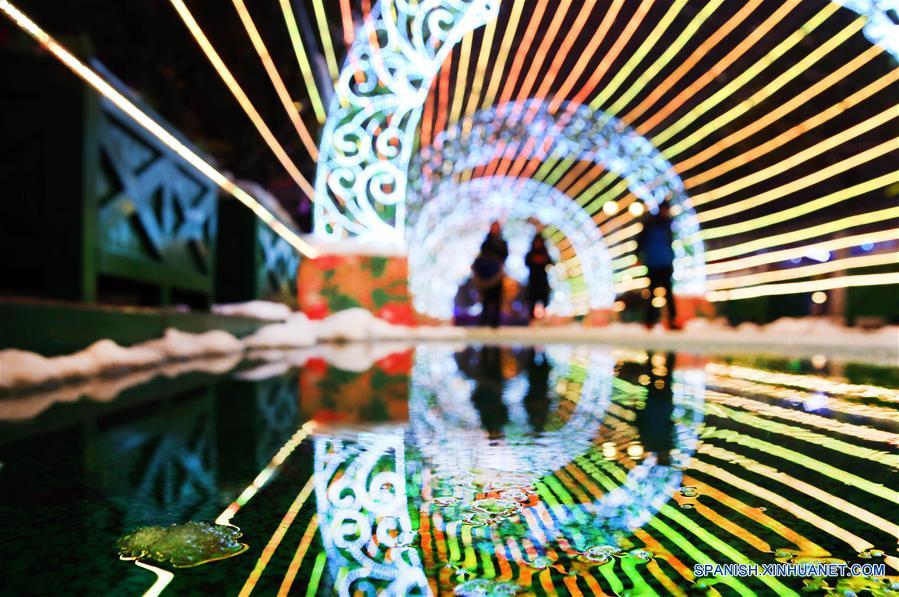 Visitantes recorren el espectáculo de linternas en el parque Nantong Adventure Land, en Nantong, provincia de Jiangsu, en el este de China, el 27 de enero de 2018. El espectáculo de linternas permanecerá hasta marzo de este a?o. (Xinhua/Xu Congjun)