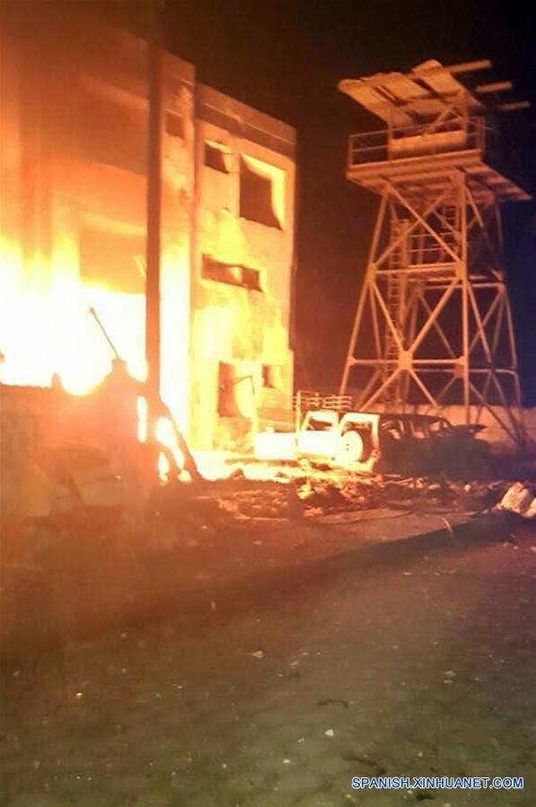 SAN LORENZO, enero 27, 2018 (Xinhua) -- Imagen cedida por el Ministerio del Interior ecuatoriano tomada con un dispositivo móvil, de fuego ardiendo en el sitio del atentado perpetrado contra un comando policial, en San Lorenzo, provincia de Esmeraldas, Ecuador, el 27 de enero de 2017. El presidente de Ecuador, Lenín Moreno, decretó el sábado el estado de excepción en los cantones San Lorenzo y Eloy Alfaro, provincia de Esmeraldas (norte), fronteriza con Colombia, tras el atentado perpetrado contra un comando policial que dejó 23 heridos. Tras solidarizarse con los heridos, Moreno informó que ordenó el reforzamiento de personal policial y militar y la presencia del ministro del Interior, César Navas, en la zona. Navas informó este sábado que la detonación ocurrida la madrugada de este sábado en la parte posterior del comando policial de San Lorenzo afectó al 95 por ciento del edificio, sin dejar víctimas mortales. (Xinhua/Ministerio del Interior ecuatoriano)