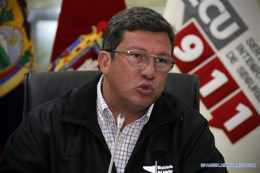QUITO, enero 27, 2018 (Xinhua) -- El ministro del Interior ecuatoriano, César Navas, participa durante una conferencia de prensa en las instalaciones del Ecu 911, en Quito, capital de Ecuador, el 27 de enero de 2017. El presidente de Ecuador, Lenín Moreno, decretó el sábado el estado de excepción en los cantones San Lorenzo y Eloy Alfaro, provincia de Esmeraldas (norte), fronteriza con Colombia, tras el atentado perpetrado contra un comando policial que dejó 23 heridos. Tras solidarizarse con los heridos, Moreno informó que ordenó el reforzamiento de personal policial y militar y la presencia del ministro del Interior, César Navas, en la zona. Navas informó este sábado que la detonación ocurrida la madrugada de este sábado en la parte posterior del comando policial de San Lorenzo afectó al 95 por ciento del edificio, sin dejar víctimas mortales. (Xinhua/Santiago Armas)