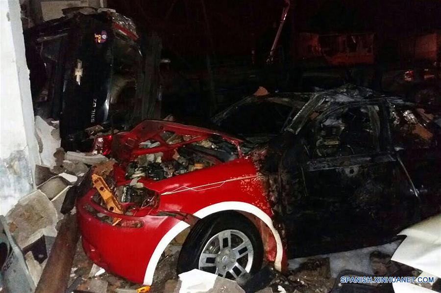 SAN LORENZO, enero 27, 2018 (Xinhua) -- Imagen cedida por el Ministerio del Interior ecuatoriano tomada con un dispositivo móvil, de un vehículo afectado por el atentado perpetrado contra un comando policial, en San Lorenzo, provincia de Esmeraldas, Ecuador, el 27 de enero de 2017. El presidente de Ecuador, Lenín Moreno, decretó el sábado el estado de excepción en los cantones San Lorenzo y Eloy Alfaro, provincia de Esmeraldas (norte), fronteriza con Colombia, tras el atentado perpetrado contra un comando policial que dejó 23 heridos. Tras solidarizarse con los heridos, Moreno informó que ordenó el reforzamiento de personal policial y militar y la presencia del ministro del Interior, César Navas, en la zona. Navas informó el sábado que la detonación ocurrida la madrugada de este sábado en la parte posterior del comando policial de San Lorenzo afectó al 95 por ciento del edificio, sin dejar víctimas mortales. (Xinhua/Ministerio del Interior ecuatoriano)