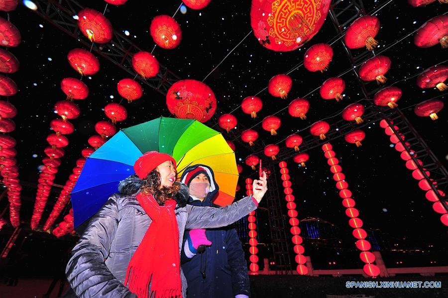 SHANDONG, enero 28, 2018 (Xinhua) -- Personas toman fotografías entre linternas sobre una calle en Weifang, en la provincia de Shandong, en el este de China, el 27 de enero de 2018. (Xinhua/Wang Jilin)