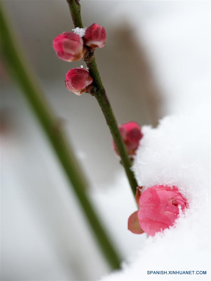NANJING, enero 27, 2018 (Xinhua) -- Flores de ciruelo rojo permanecen cubiertas de nieve en la zona escénica Zhongshan en Nanjing, capital de la provincia de Jiangsu, en el este de China, el 27 de enero de 2018. (Xinhua/Wang Yuewu) (da)
