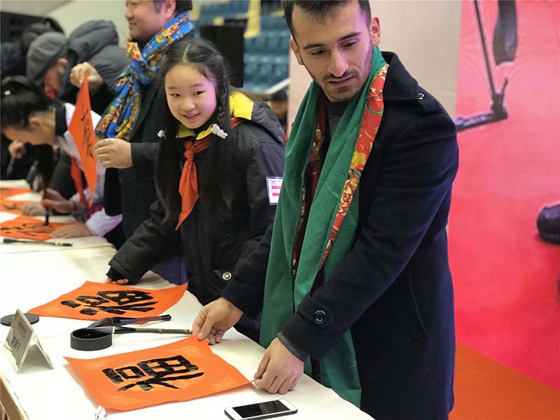 Participantes escriben frases auspiciosas sobre papel rojo, Shanghai, 28 de enero del 2018. [Foto: proporcionada]