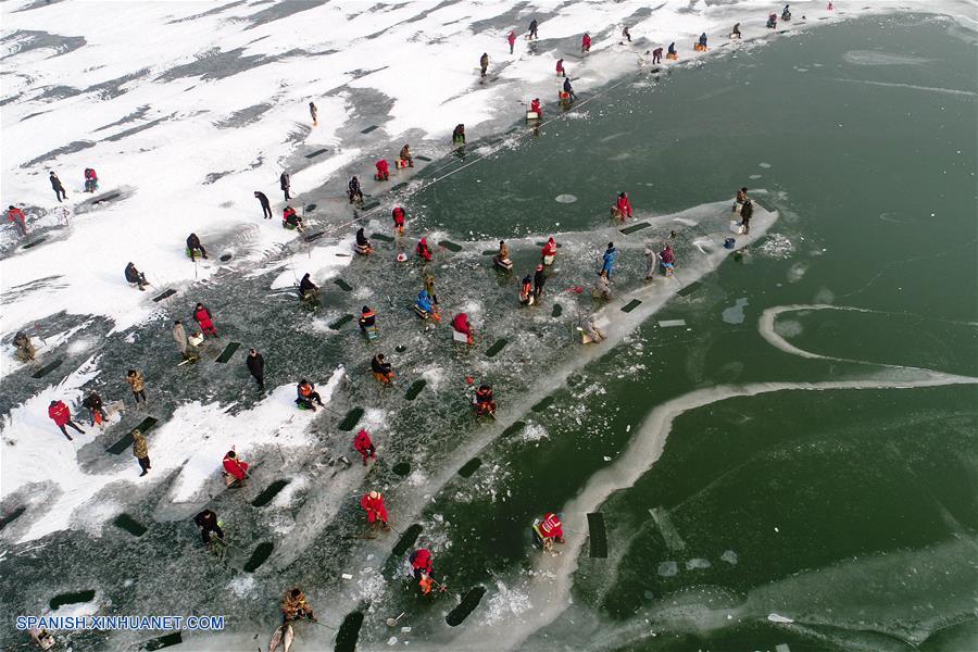 HEBEI, enero 27, 2018 (Xinhua) -- Personas pescan sobre el Lago Caofei, en Tangshan, en la provincia de Hebei, en el norte de China, el 27 de enero de 2018. (Xinhua/Yang Shiyao)