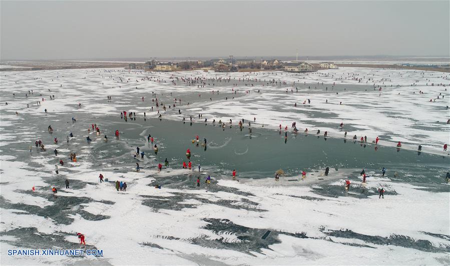 HEBEI, enero 27, 2018 (Xinhua) -- Personas pescan sobre el Lago Caofei, en Tangshan, en la provincia de Hebei, en el norte de China, el 27 de enero de 2018. (Xinhua/Yang Shiyao)