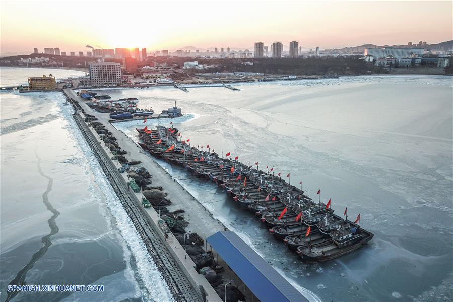 LIAONING, enero 29, 2018 (Xinhua) -- Botes pesqueros permanecen sobre el hielo marino en las aguas circundantes de la ciudad de Xingcheng, en la provincia de Liaoning, en el noreste de China, el 29 de enero de 2018. El hielo marino se formó en la región debido a la baja temperatura continua. (Xinhua/Pan Yulong)