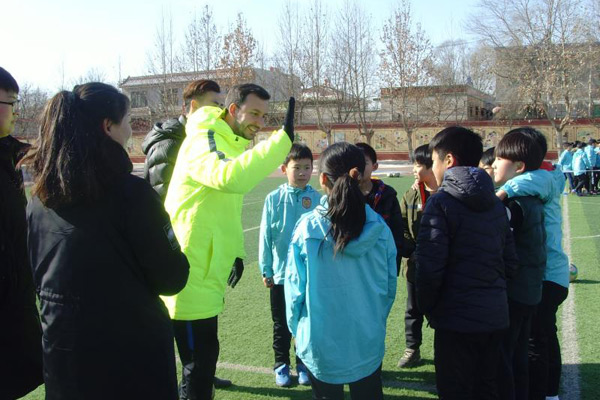 Uno de los entrenadores del Football Club Internazionale Milano ense?a en la Escuela Primaria Xiongxian No. 1 de la provincia de Hebei, China 29 de enero del 2018. [Foto: proporcionada]