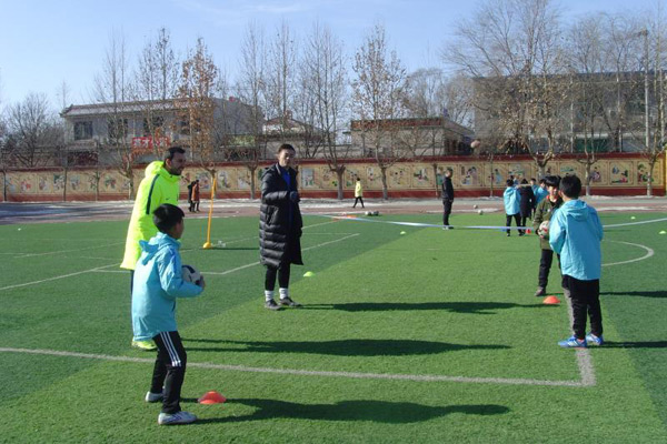 Uno de los entrenadores del Football Club Internazionale Milano ense?a en la Escuela Primaria Xiongxian No. 1 de la provincia de Hebei, China 29 de enero del 2018. [Foto: proporcionada]