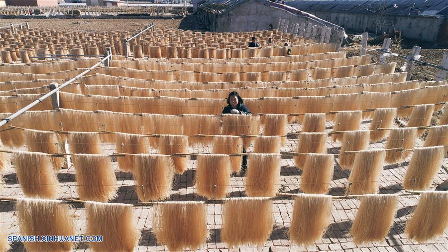 HEBEI, enero 30, 2018 (Xinhua) -- Residentes secan fideos vermicelli, en la villa de Zhongtan del municipio de Ping'ancheng, provincia de Hebei, en el norte de China, el 30 de enero de 2018. Los residentes han estado atareados secando fideos vermicelli para hacer frente a la demanda del mercado. (Xinhua/Liu Mancang)