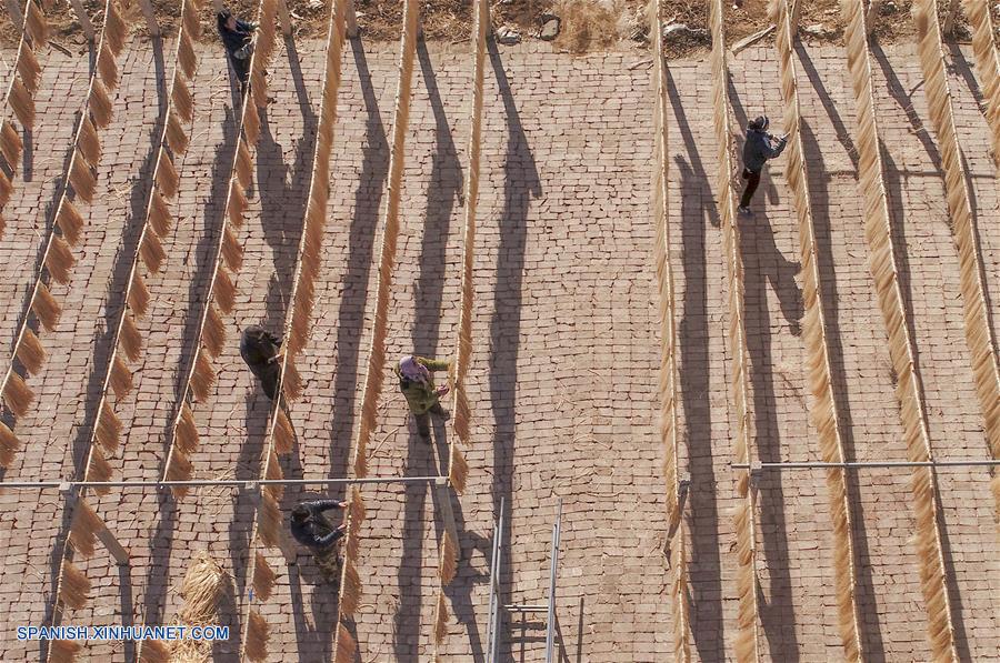HEBEI, enero 30, 2018 (Xinhua) -- Residentes secan fideos vermicelli, en la villa de Zhongtan del municipio de Ping'ancheng, provincia de Hebei, en el norte de China, el 30 de enero de 2018. Los residentes han estado atareados secando fideos vermicelli para hacer frente a la demanda del mercado. (Xinhua/Liu Mancang)