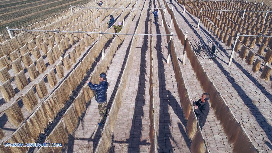 HEBEI, enero 30, 2018 (Xinhua) -- Residentes secan fideos vermicelli, en la villa de Zhongtan del municipio de Ping'ancheng, provincia de Hebei, en el norte de China, el 30 de enero de 2018. Los residentes han estado atareados secando fideos vermicelli para hacer frente a la demanda del mercado. (Xinhua/Liu Mancang)