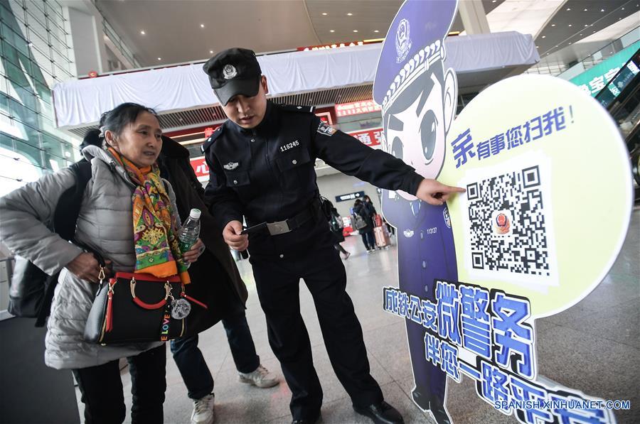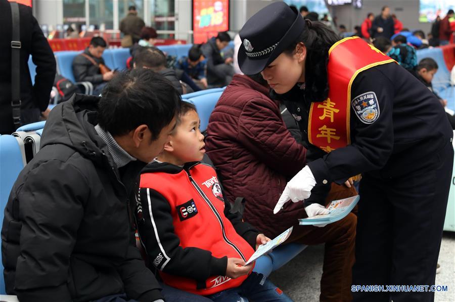 GUIZHOU, febrero 1, 2018 (Xinhua) -- Una oficial de policía distribuye folletos sobre la seguridad para viajar en la Estación del Ferrocarril de Guiyang Norte, en Guiyang, capital de la provincia de Guizhou, en el suroeste de China, el 1 de febrero de 2018. La temporada alta de viajes del Festival de Primavera 2018, conocido como Chunyun, comenzó el jueves y durará hasta el 12 de marzo. Se espera que se realicen cerca de 2.980 millones de viajes durante el Chunyun. El Festival de Primavera, o A?o Nuevo Lunar chino, se celebra el 16 de febrero este a?o. (Xinhua/Ou Dongqu)