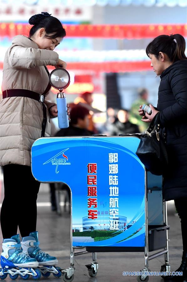 HEBEI, febrero 1, 2018 (Xinhua) -- Una empleada proporciona bebidas a los pasajeros en la Estación de Autobuses de Baoding, en Baoding, provincia de Hebei, en el norte de China, el 1 de febrero de 2018. La temporada alta de viajes del Festival de Primavera 2018, conocido como Chunyun, comenzó el jueves y durará hasta el 12 de marzo. Se espera que se realicen cerca de 2.980 millones de viajes durante el Chunyun. El Festival de Primavera, o A?o Nuevo Lunar chino, se celebra el 16 de febrero este a?o. (Xinhua/Wang Xiao)