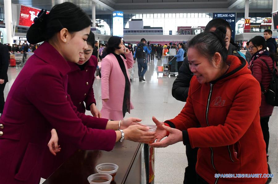 GUANGXI, febrero 1, 2018 (Xinhua) -- Empleadas proporcionan bebidas a los pasajeros en la Estación del Ferrocarril de Nanning Este, en Nanning, provincia de Guangxi, en el sur de China, el 1 de febrero de 2018. La temporada alta de viajes del Festival de Primavera 2018, conocido como Chunyun, comenzó el jueves y durará hasta el 12 de marzo. Se espera que se realicen cerca de 2.980 millones de viajes durante el Chunyun. El Festival de Primavera, o A?o Nuevo Lunar chino, se celebra el 16 de febrero este a?o. (Xinhua/Zhang Guojun)