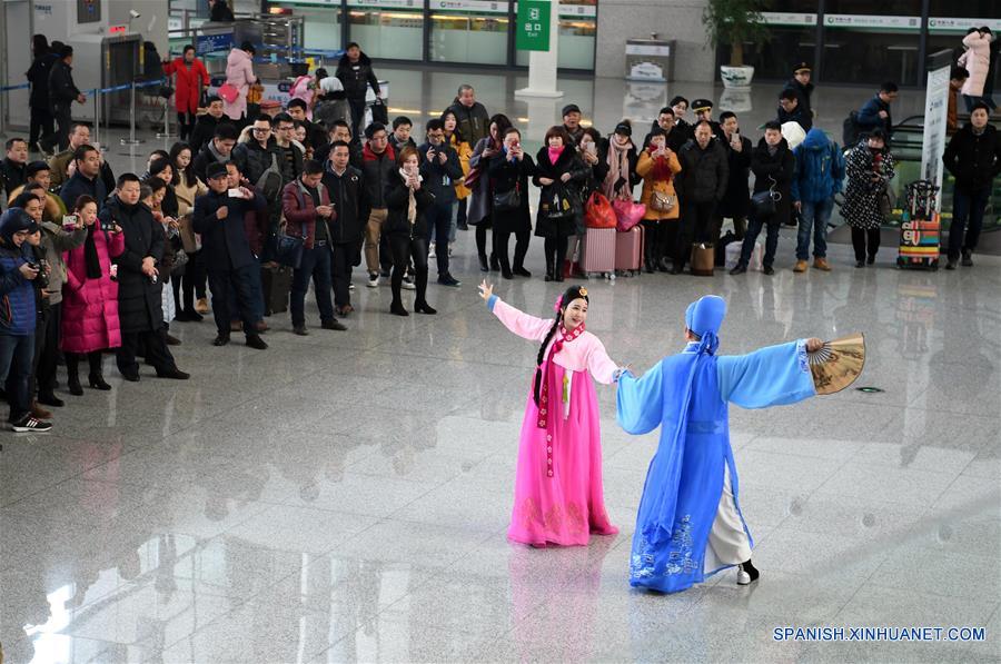 ANHUI, febrero 1, 2018 (Xinhua) -- Artistas interpretan una ópera para los pasajeros en la Estación del Ferrocarril de Hefei Sur, en Hefei, provincia de Anhui, en el este de China, el 1 de febrero de 2018. La temporada alta de viajes del Festival de Primavera 2018, conocido como Chunyun, comenzó el jueves y durará hasta el 12 de marzo. Se espera que se realicen cerca de 2.980 millones de viajes durante el Chunyun. El Festival de Primavera, o A?o Nuevo Lunar chino, se celebra el 16 de febrero este a?o. (Xinhua/Liu Junxi)