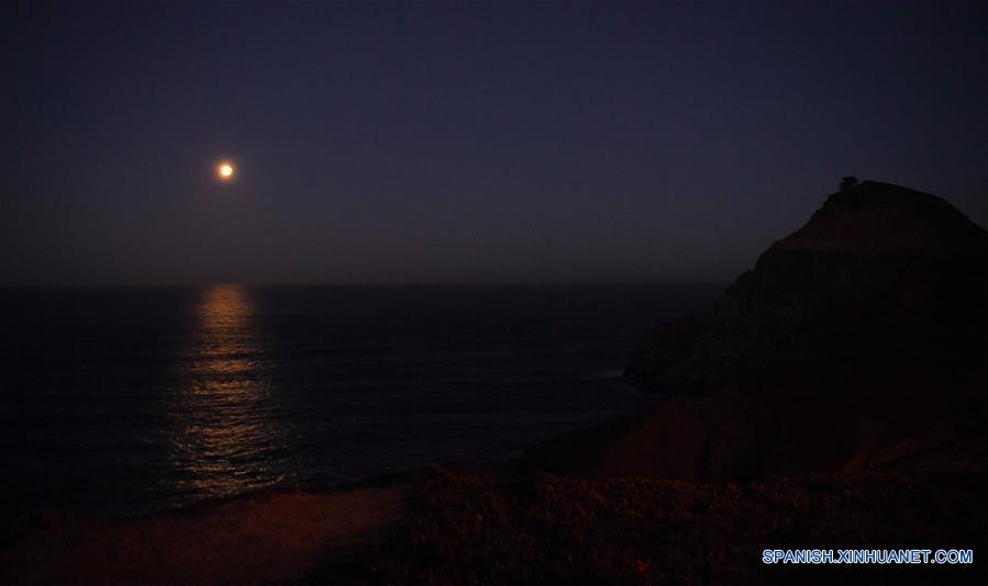 SAN FRANCISCO, enero 31, 2018 (Xinhua) -- La Luna se eleva durante un eclipse lunar, en la zona de la bahía de San Francisco, Estados Unidos, el 31 de enero de 2018. (Xinhua/Wu Xiaoling)