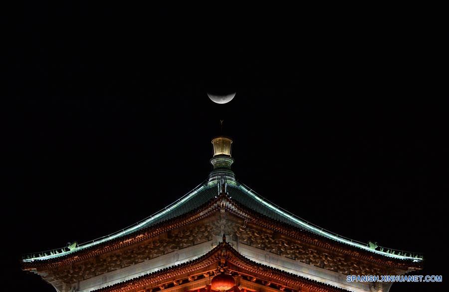 La Luna se eleva sobre una torre del reloj en Xi'an, en la provincia de Shaanxi, en el noroeste de China, el 31 de enero de 2018. La personas alrededor de China observaron en el cielo la rara Superluna azul de sangre el miércoles por la noche. (Xinhua/Li Yibo)