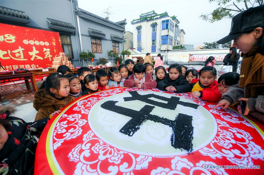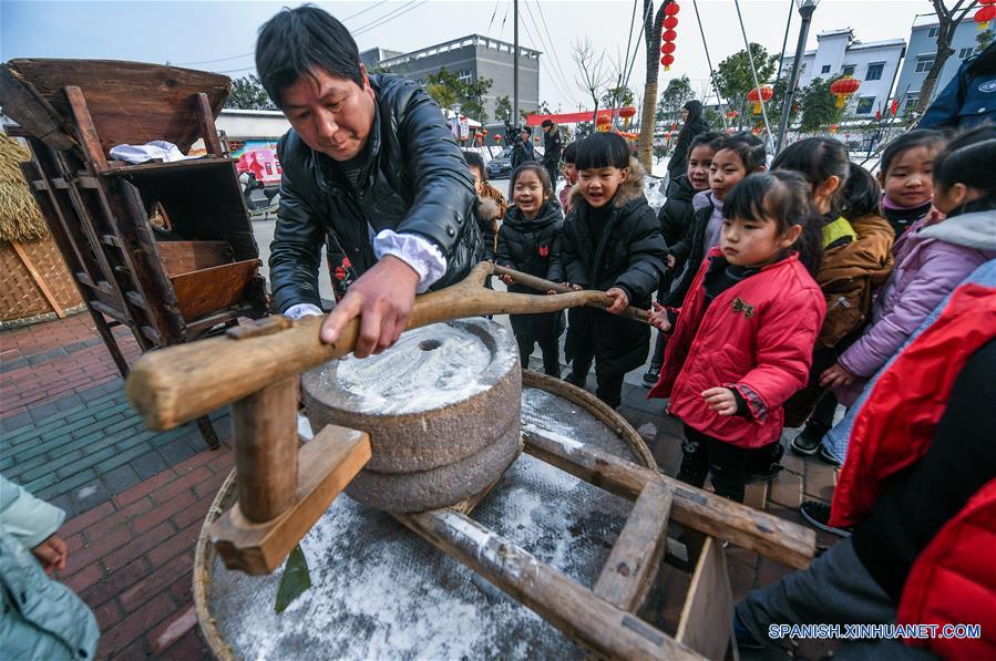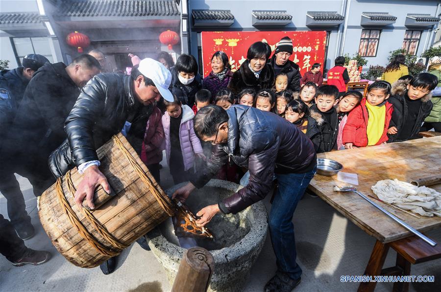 ZHEJIANG, febrero 1, 2018 (Xinhua) -- Un grupo de ni?os observa a un residente elaborar tartas de arroz, en la villa de Hexidai en el municipio de Tangqi, Hangzhou, capital de la provincia de Zhejiang, en el este de China, el 1 de febrero de 2018. Los residentes participaron el jueves en una serie de actividades tradicionales en Hexidai, para recibir el A?o Nuevo Lunar chino, que se celebra el 16 de febrero este a?o. (Xinhua/Xu Yu)