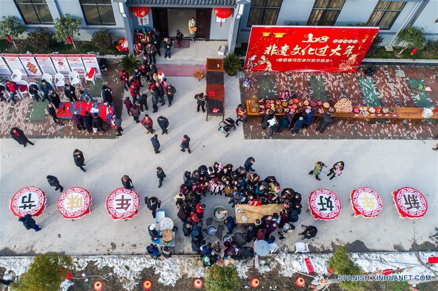 ZHEJIANG, febrero 1, 2018 (Xinhua) -- Residentes elaboran tartas de arroz, en la villa de Hexidai en el municipio de Tangqi, Hangzhou, capital de la provincia de Zhejiang, en el este de China, el 1 de febrero de 2018. Los residentes participaron el jueves en una serie de actividades tradicionales en Hexidai, para recibir el A?o Nuevo Lunar chino, que se celebra el 16 de febrero este a?o. (Xinhua/Xu Yu)