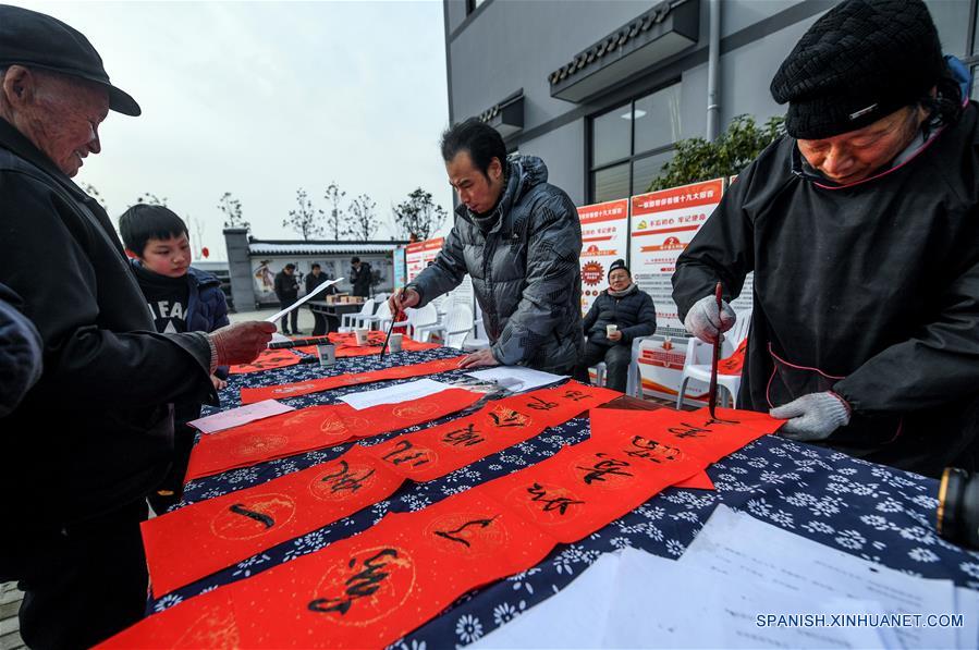 ZHEJIANG, febrero 1, 2018 (Xinhua) -- Residentes escriben versos pareados de primavera, en la villa de Hexidai en el municipio de Tangqi, Hangzhou, capital de la provincia de Zhejiang, en el este de China, el 1 de febrero de 2018. Los residentes participaron el jueves en una serie de actividades tradicionales en Hexidai, para recibir el A?o Nuevo Lunar chino, que se celebra el 16 de febrero este a?o. (Xinhua/Xu Yu)