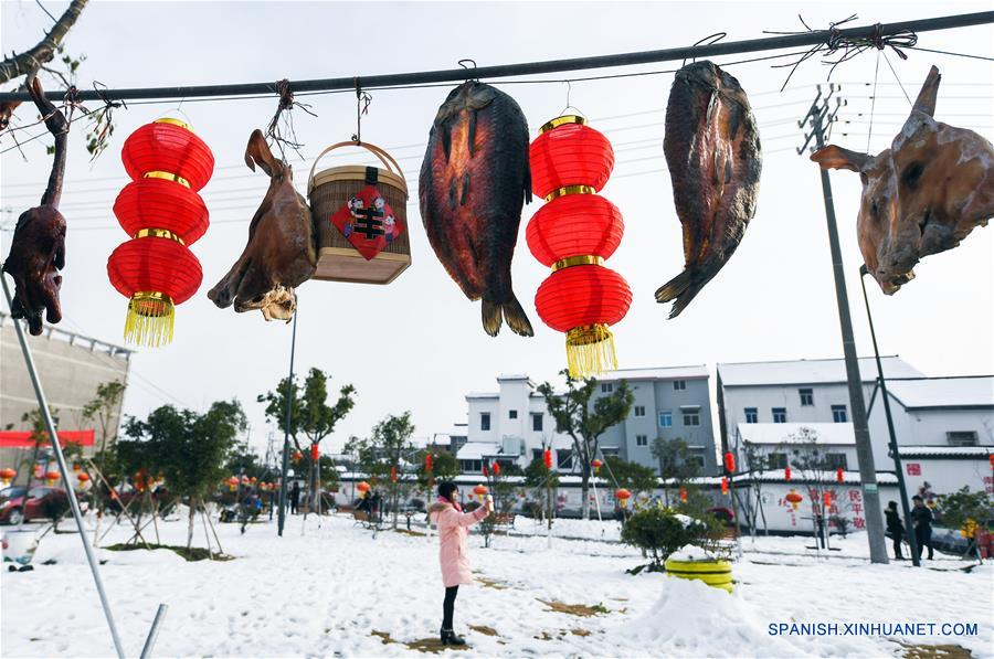 ZHEJIANG, febrero 1, 2018 (Xinhua) -- Linternas y aparejos del Festival de Primavera son exhibidos en la villa de Hexidai en el municipio de Tangqi, Hangzhou, capital de la provincia de Zhejiang, en el este de China, el 1 de febrero de 2018. Los residentes participaron el jueves en una serie de actividades tradicionales en Hexidai, para recibir el A?o Nuevo Lunar chino, que se celebra el 16 de febrero este a?o. (Xinhua/Xu Yu)