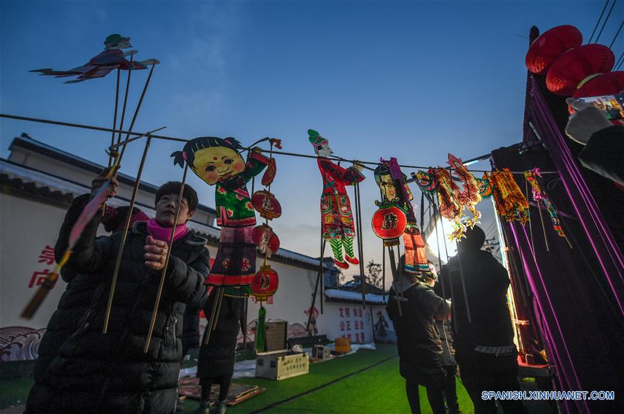 ZHEJIANG, febrero 1, 2018 (Xinhua) -- Artistas populares realizan teatro de sombras tradicional, en la villa de Hexidai en el municipio de Tangqi, Hangzhou, capital de la provincia de Zhejiang, en el este de China, el 1 de febrero de 2018. Los residentes participaron el jueves en una serie de actividades tradicionales en Hexidai, para recibir el A?o Nuevo Lunar chino, que se celebra el 16 de febrero este a?o. (Xinhua/Xu Yu)