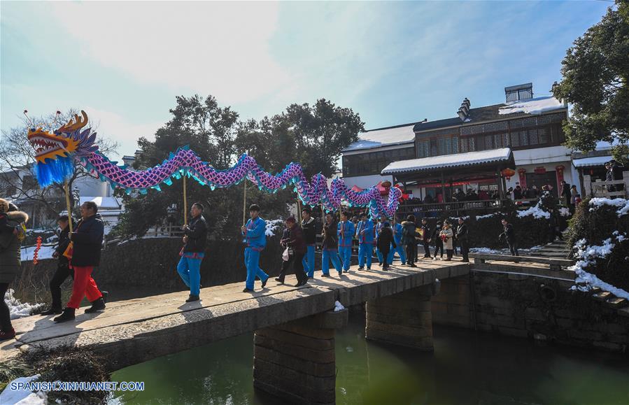 ZHEJIANG, febrero 4, 2018 (Xinhua) -- Aldeanos interpretan la danza del dragón sobre una balsa en la aldea Shangsi'an del municipio Si'an, en el condado Changxing, provincia de Zhejiang, en el este de China, el 4 de febrero de 2018. Un mercado ofreciendo productos del festival de primavera comenzó el domingo. El "Lichun" que significa literalmente el comienzo de la primavera en chino, es el primero de 24 periodos solares y este a?o se celebra el 4 de febrero. (Xinhua/Xu Yu)
